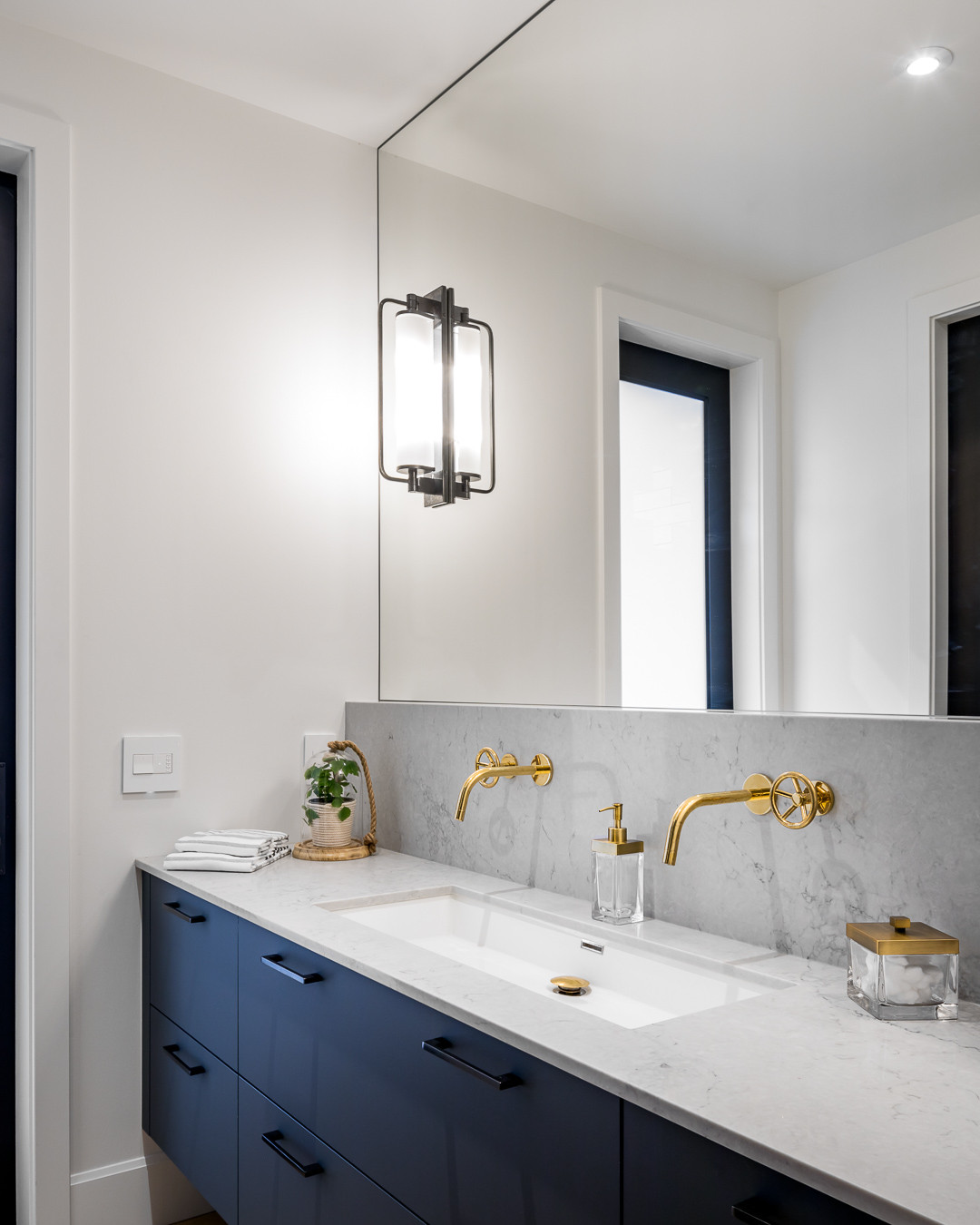 This Jack Jill bath has a Duravit trough sink plenty of counter and storage space.